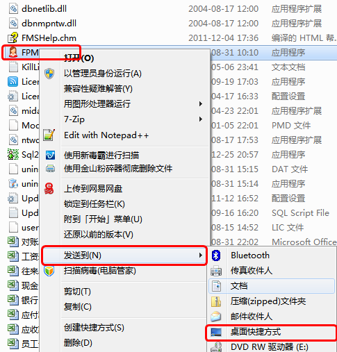 2、重新建立快捷方式,在修改后目錄下的FPMS.exe文件上,點鼠標右鍵,再點“發(fā)送到”-》“桌面快捷方式”,發(fā)送快捷方式到桌面。默認快捷方式為“FPMS.exe - 快捷方式”,可以將快捷方式名改為“紅管家財務(wù)出納記賬系統(tǒng)”。桌面上原來的快捷方式是指向修改前目錄的,可以刪除掉。