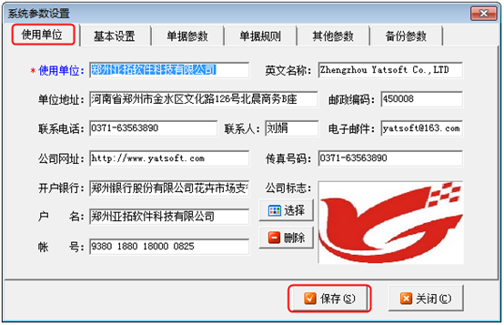 登錄軟件,在功能導(dǎo)航窗點“系統(tǒng)管理”——》“系統(tǒng)參數(shù)”菜單項,系統(tǒng)彈出如圖1所示的窗口,在“使用單位”選項下可以填寫使用單位的信息。其中單位名稱為必填項,其他項目可根據(jù)需要進行選填。如需添加公司標志,點擊“選擇”按鈕,選擇準備好的公司標志;如需刪除公司標志,點擊“刪除”按鈕。使用單位信息錄入后點擊“保存”按鈕即可。