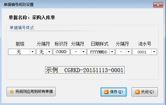 我們可以根據自己的需求進行單據編號設置,軟件中內置的前綴、分隔符、日期樣式以及流水號有多種樣式可供我們選擇,其中標識符可根據自己的需求進行設置。我們可以分別對需要修改的單據編號進行設置,也可以將某一個單據中設置的規則應用到所有單據。