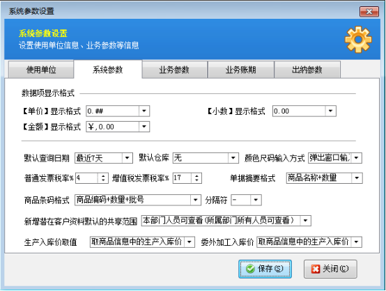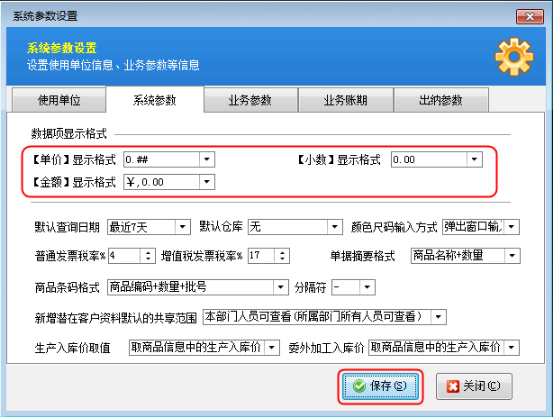 在系統(tǒng)參數(shù)中對“單價”、“小數(shù)”(數(shù)量)、“金額”選擇相應(yīng)的顯示格式后點擊“保存”按鈕即可,在軟件中這些數(shù)據(jù)項的顯示格式會改變。如圖3所示設(shè)置后,在圖4的銷售出庫單可看到相應(yīng)的數(shù)據(jù)項的顯示格式。