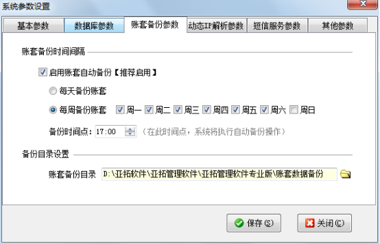 另外在“系統參數”——“賬套備份參數”中可以設置是否啟用自動備份、備份時間間隔和備份目錄。我們強烈建議啟用自動備份,以便賬套出現問題的時候從賬套備份文件中恢復數據。