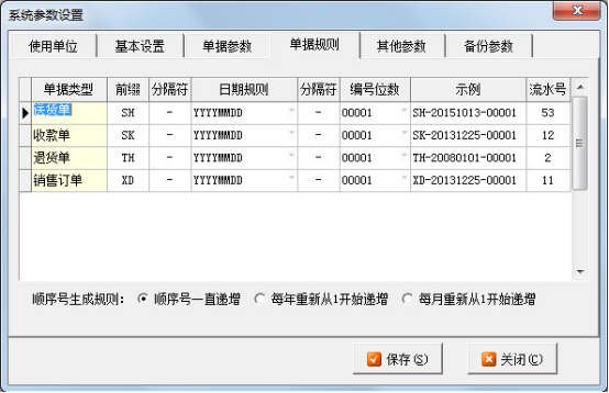 2、順序號生成規則設置:可配置各類單據按順序號一直遞增、每年重新從1開始遞增以及每月重新從1開始遞增,將各項數據配置好之后點擊保存即可。