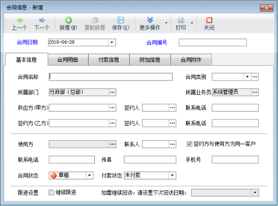 軟件支持三方合同,即簽約方與使用方不是一家單位(比如渠道代理銷售的情況)。合同中涉及的客戶信息如果不存在,可以直接錄入新客戶。