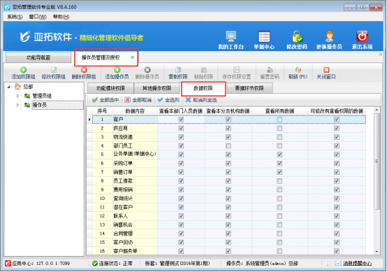 亞拓管理軟件、紅管家出納記賬軟件、紅管家倉庫管理軟件等都可以設置操作員的查看修改業務單據權限。通過設置操作員的“數據權限”,更清晰方便的管理分配的操作員單據權限。通過“系統管理”---》操作員及授權進入操作員管理及授權界面,在權限模塊可看到“數據權限”,在此設置操作員的“可修改有查看權限的數據”的權限,如圖1所示: