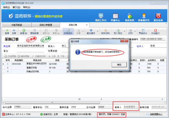 單據權限設置成功后,以操作員李靜的身份登錄軟件,打開已審核的“采購訂單”選擇“反審修改”,如果制單人不是李靜,則會提示信息“當前單據屬于其他部門,您沒有權限進行修改”。操作員李靜只能反審修改自己制的采購訂單,無法修改其他部門人員的單據。如圖3所示:圖3