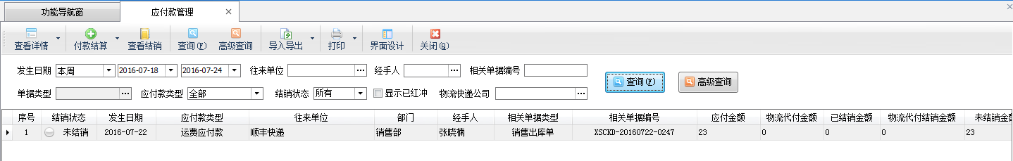 (2)代客戶付運費(生成運費應(yīng)付款,運費計入應(yīng)收金額):運費付款類別選擇“代客戶付運費(生成運費應(yīng)付款,運費計入應(yīng)收金額)”時,輸入物流運費后,保存并審核單據(jù)的時候,運費可以合計到“應(yīng)收金額”內(nèi),并生成“物流運費應(yīng)付款”,在功能導(dǎo)航窗點“往來管理”—》“應(yīng)付款管理”內(nèi)對“運費應(yīng)付款”進行運費付款結(jié)算即可。