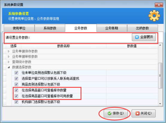 在功能導(dǎo)航窗,點(diǎn)擊“系統(tǒng)參數(shù)配置”—》“業(yè)務(wù)參數(shù)”選擇“數(shù)據(jù)選擇參數(shù)”進(jìn)行設(shè)置,(為了更快捷的設(shè)置業(yè)務(wù)參數(shù),可以先把設(shè)置業(yè)務(wù)參數(shù)“全部折疊”,直接查找“數(shù)據(jù)選擇參數(shù)”項(xiàng)),勾選參數(shù)后記得保存,具體操作如圖1所示: