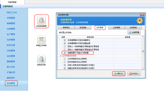 在功能導航窗點擊“系統管理”—》“系統參數配置”—》“業務參數”,即可進入到“業務參數”界面,勾選“銷售數量不可超過訂單數量”參數,然后點擊“保存”按鈕保存配置,如圖1所示。