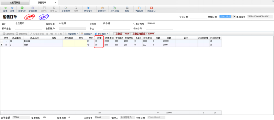 設置完之后,在功能導航窗點擊“銷售管理”—》“銷售訂單”,新增銷售訂單,錄入兩條商品的數量分別是“10”,然后保存審核訂單,如圖2所示。