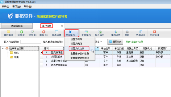 軟件支持批量操作,可以批量選擇多個客戶信息后,把多個客戶信息同時設置為供應商信息,如圖4所示。