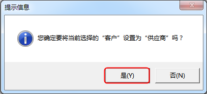 選擇一個客戶“星光糧油店”后點擊“更多操作”—》“設置為供應商”,系統會彈出提示信息“您確定要將當前選擇的“客戶”設置為“供應商”嗎?”,如圖2所示,點擊“是”按鈕,該客戶信息就轉變為供應商信息了。