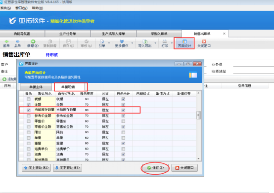 打開軟件的“銷售管理”模塊,新開一個銷售出庫單,點擊“界面設(shè)計”選擇“單據(jù)明細(xì)”數(shù)據(jù)項,找到“當(dāng)前庫存數(shù)量”數(shù)據(jù)項并勾選上,保存界面設(shè)計。具體如圖1所示: