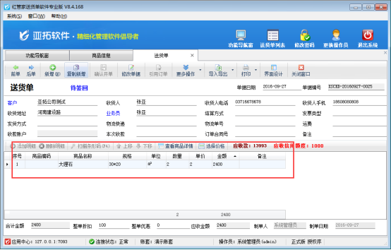設置好以后進行開單,選擇商品為大理石(規格是30*20),假設數量為2,單價為2,金額=規格*數量*單價=30*20*2*2=2400。具體在單據中體現如下圖所示