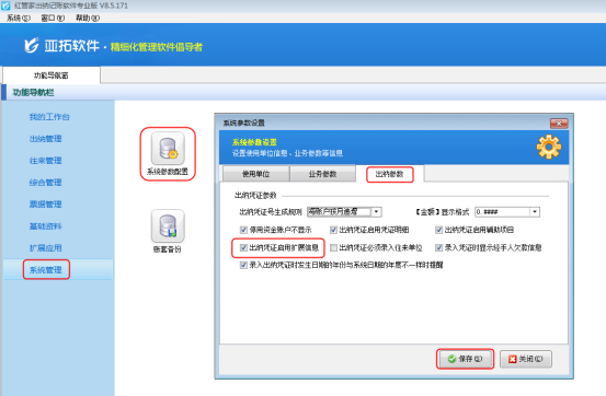 打開“系統(tǒng)管理”—》“系統(tǒng)參數(shù)配置”,在“出納參數(shù)”界面勾選“出納憑證啟用擴(kuò)展信息”然后保存,如圖1所示。