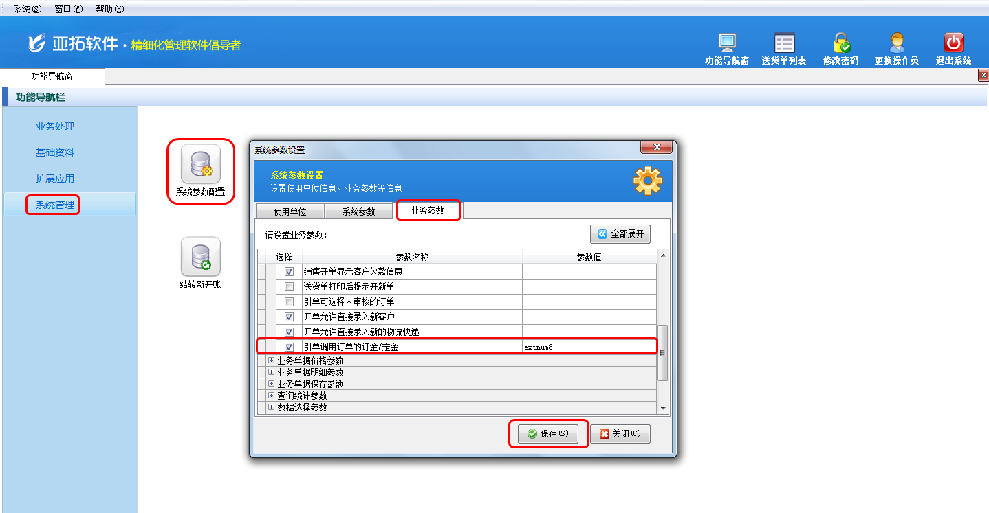 在功能導航窗點擊“系統管理”——》“系統參數設置”——》“業務參數”可以進入到“業務參數”配置界面,在業務單據相關參數內打勾啟用“引單調用訂單的定金/訂金”參數,并設置參數值(擴展數值字段名),默認為“extnum8(擴展數值8)”,如下圖一所示。