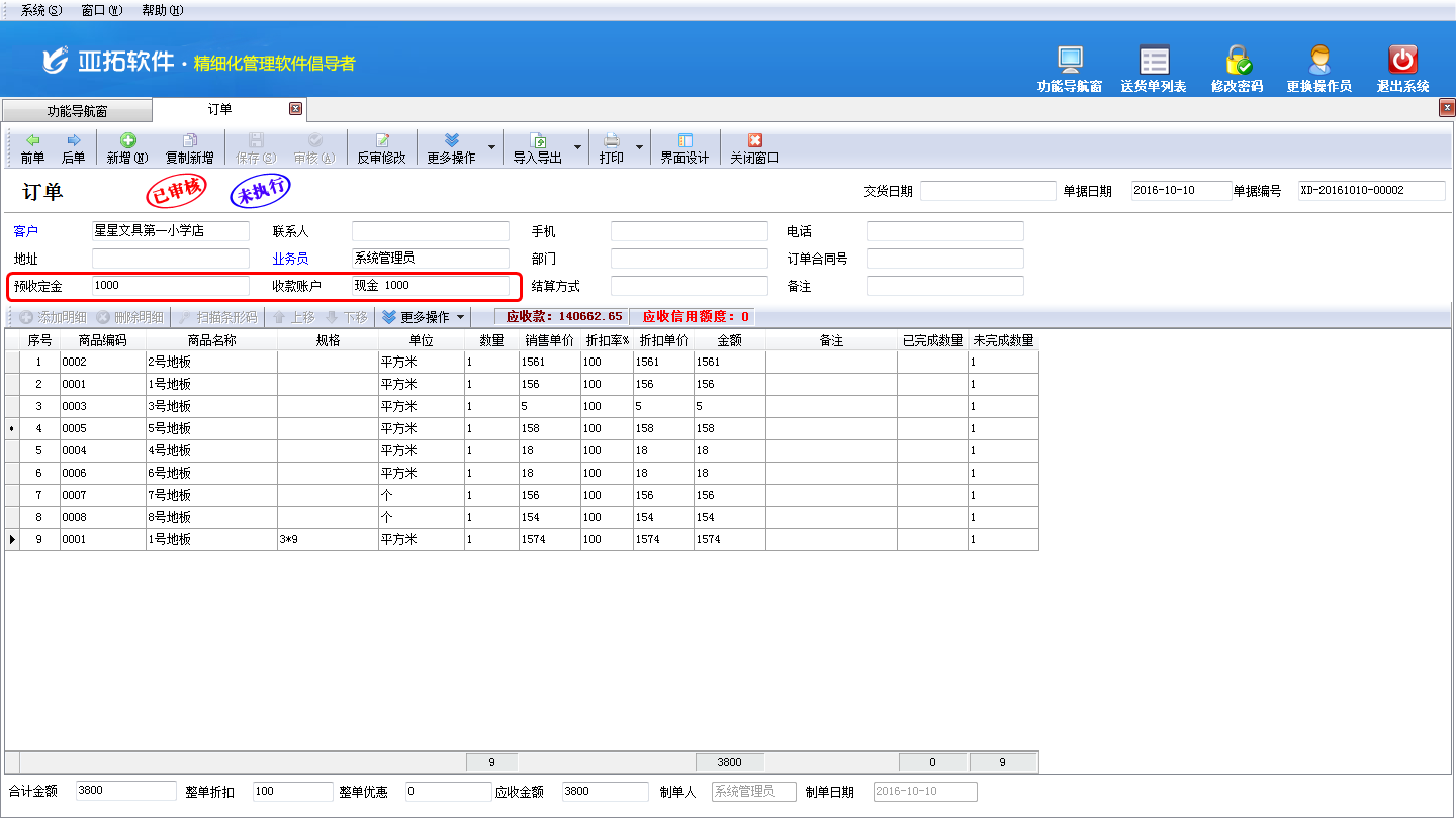 設置完成之后,在功能導航窗點擊“業務處理”——》“新開訂單”,新增一個預收定金的訂單(在訂單界面“界面設計”—》“單據主體”內可以將字段“預收訂金”、“收款賬戶”配置顯示出來,并可通過“向上移動”、“向下移動”調整字段顯示位置),如下圖二所示,此訂單預收定金1000元。
