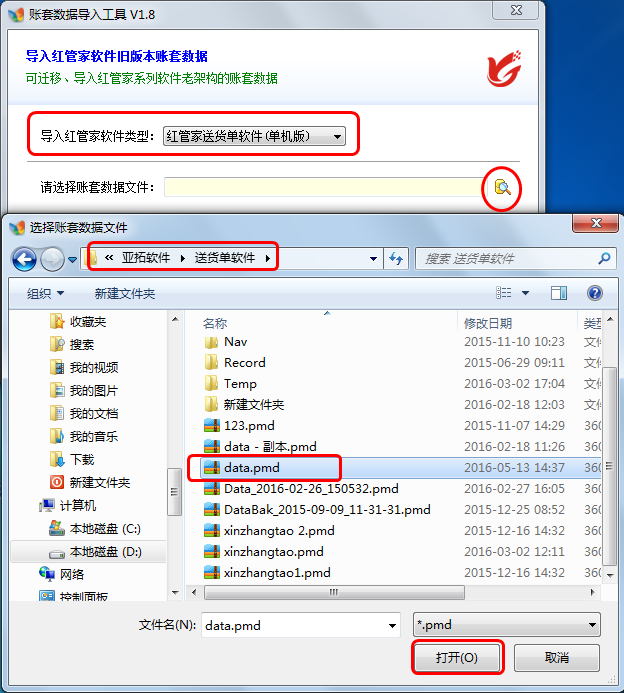 圖二  導(dǎo)入紅管家送貨單軟件(單機(jī)版)賬套數(shù)據(jù)文件