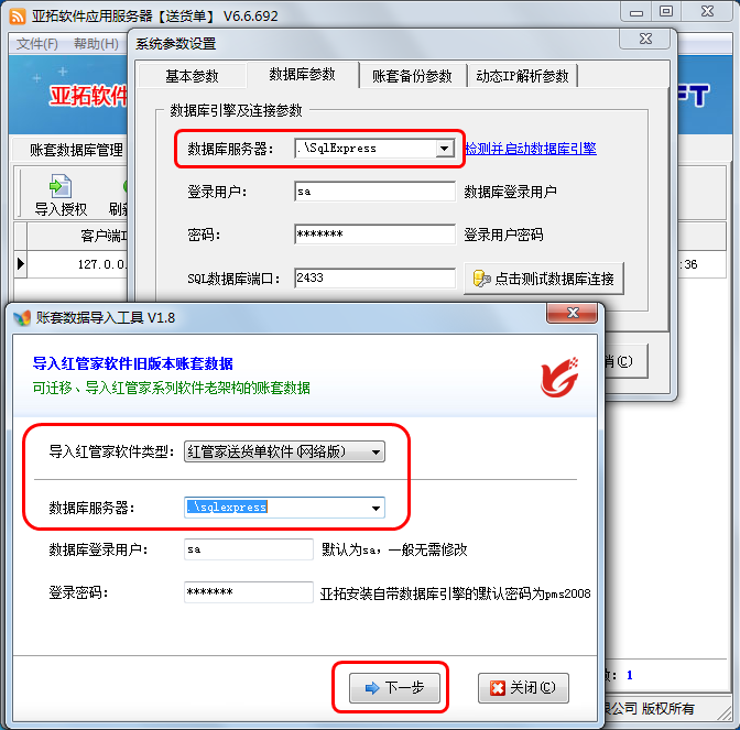 導(dǎo)入紅管家送貨單軟件(網(wǎng)絡(luò)版)賬套數(shù)據(jù):首先“導(dǎo)入紅管家軟件類型”選擇“紅管家送貨單軟件(網(wǎng)絡(luò)版)”,然后選擇數(shù)據(jù)庫服務(wù)器(與老架構(gòu)應(yīng)用服務(wù)器內(nèi)“系統(tǒng)參數(shù)設(shè)置”——》“數(shù)據(jù)庫參數(shù)”內(nèi)所設(shè)置的“數(shù)據(jù)庫服務(wù)器”保持一致,如下圖三所示),然后點擊“下一步”,選擇需要導(dǎo)入的賬套文件點擊“開始導(dǎo)入”即可開始導(dǎo)入網(wǎng)絡(luò)版賬套數(shù)據(jù)。