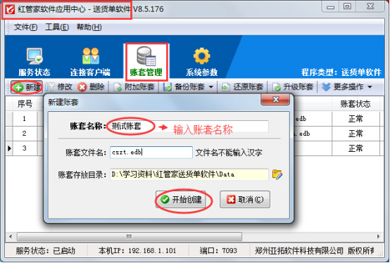 賬套即賬套數據庫,這是一個從會計業務引申出來的概念,賬套數據庫中存儲業務數據。使用軟件前建議新增加一個賬套,用于重新錄入和管理數據。本軟件的賬套是集中在主機電腦上的應用中心程序(紅色圖標)上進行的。我們公司的亞拓管理軟件、紅管家送貨單軟件、紅管家出納軟件等都支持新建多賬套使用。以紅管家送貨單為例,示范下如何進行新建賬套和選擇新賬套使用軟件?