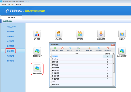 在功能導航窗點擊“基礎資料”—》“常用摘要維護”即可打開“常用摘要維護”界面,如圖1所示,在常用摘要維護窗口可以進行新增、刪除、導入、導出摘要信息等操作,最后點擊“保存”按鈕進行保存即可。