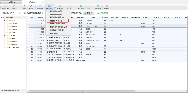 在功能導航窗點擊“基礎資料”—》“商品信息”打開商品信息主界面,在工具欄點擊“更多操作”—》“批量維護商品信息”可以打開批量維護商品信息界面,如下圖一所示。