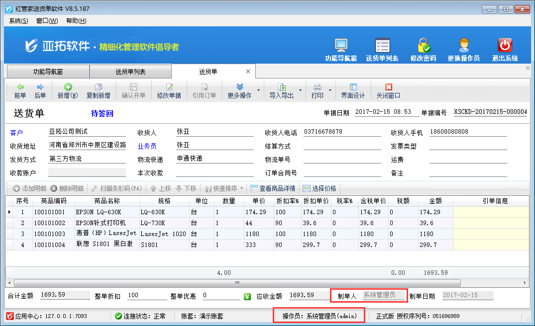 亞拓管理軟件、紅管家送貨單軟件、紅管家倉庫管理軟件、紅管家出納記賬軟件、紅管家票據(jù)打印軟件等安裝后默認(rèn)登陸的操作員為“系統(tǒng)管理員”,開單時“制單人”數(shù)據(jù)為當(dāng)前操作員名稱(即“系統(tǒng)管理員”),部分用戶在使用軟件時需要將其修改為其他名稱,在軟件內(nèi)如何修改呢?本篇文章以紅管家送貨單軟件為例詳細(xì)介紹一下如何修改“制單人”名稱?