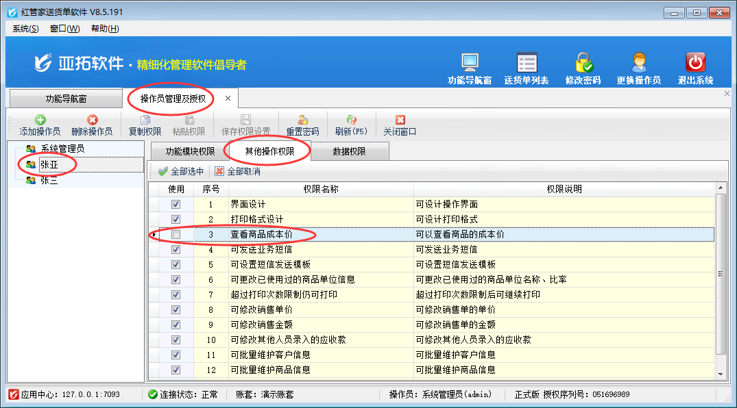 亞拓管理軟件紅管家倉庫管理軟件紅管家送貨單軟件內都可以設置多個操作員并對操作員賬號設置權限,部分用戶不希望員工賬號可以查看到商品成本價格,如何設置呢?本篇文章以紅管家送貨單軟件為例詳細介紹一下送貨單軟件內如何設置操作員不可查看商品成本價?