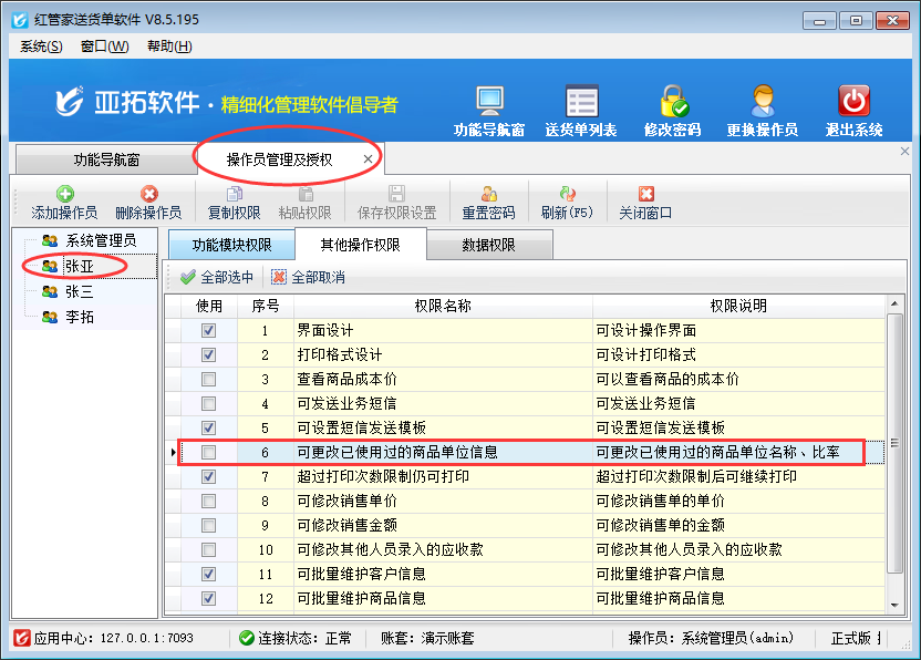在功能導航窗點“系統管理”→“操作員及授權”即可進入“操作員管理及授權”界面,選中操作員賬號,在“其他操作權限”界面將“可更改已使用過的商品單位信息”權限打鉤取消,如下圖一所示,設置操作員賬號“張亞”不可更改已使用過的商品單位信息,設置完成后點擊“保存權限設置”按鈕保存設置。
