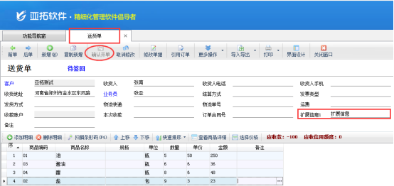 亞拓軟件下的送貨單軟件、亞拓管理軟件等最新版本增加在明細列表中可以顯示單據主體項的擴展信息。我們以送貨單軟件為例,示范下如何設置在送貨單的明細對賬單上顯示單據主體的擴展信息?