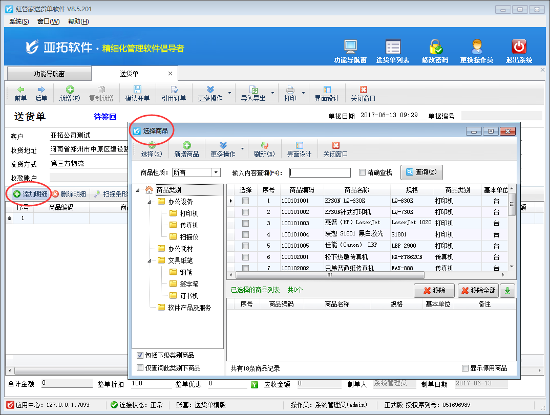 亞拓管理軟件、紅管家倉庫管理軟件、紅管家送貨單軟件等為了方便用戶可以快速開單,在單據中點擊“添加明細”按鈕默認都是彈出商品選擇窗口(如下圖一所示),可以快速選擇所需商品信息,但是部分用戶在開單時需要直接錄入新商品,而不是在商品信息庫中進行選擇,對于此種情況,軟件支持設置在單據中點擊“添加明細”按鈕時不彈出商品選擇窗口,本篇文章我們以紅管家送貨單軟件為例來詳細介紹一下如何設置在單據中點擊“添加明細”按鈕時不彈出商品選擇窗口?