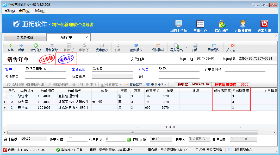 新增的銷售訂單,保存審核后默認(rèn)處于“未執(zhí)行”狀態(tài),未執(zhí)行狀態(tài)的銷售訂單內(nèi),其單據(jù)明細(xì)中每個商品明細(xì)的執(zhí)行數(shù)量(即已完成數(shù)量)為0。