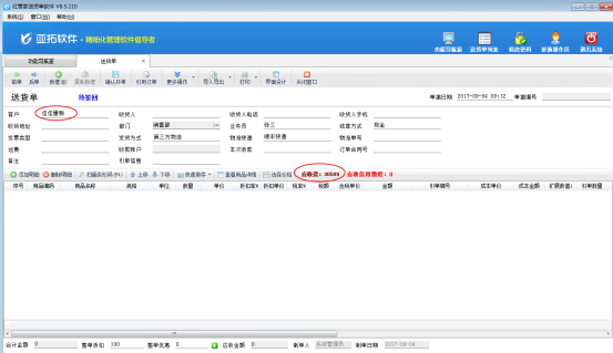 配置保存后,在功能導航窗點擊“業務處理”—》“新開送貨單”,在新增送貨單界面選擇客戶名稱后,此時可以看到單據明細上方會顯示這個客戶的應收款,即客戶的欠款,如下圖2所示。
