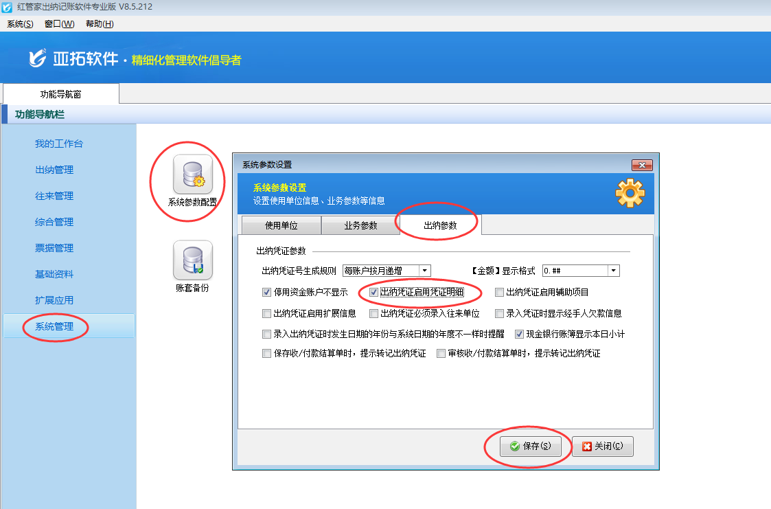 在功能導航窗點擊“系統(tǒng)管理”—》“系統(tǒng)參數(shù)配置”—》“出納參數(shù)”,即可進入到“出納參數(shù)”配置界面,在出納參數(shù)內打鉤啟用“出納憑證啟用憑證明細”參數(shù),然后保存配置,如下圖所示。