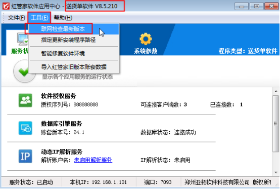本文我們以紅管家送貨單軟件為例,截止到本文發(fā)布日期,紅管家送貨單軟件最新版是V8.5.217版本,我們以V8.5.210版本為例介紹下軟件聯(lián)網(wǎng)檢查最新版的兩種方法。