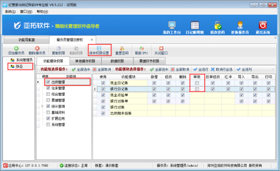 以紅管家出納記賬軟件專業版本為例,示范下如何取消操作員“張亞”的現金日記賬、銀行日記賬的可審核權限。在功能導航窗選擇“系統管理”—》“操作員及授權”—》選擇操作員“張亞”,在功能模塊權限中選擇“出納管理”,右側權限設置把現金日記賬和銀行日記賬的可審核權限的勾選符號取消,然候點擊“保存權限設置”按鈕進行保存權限,如下圖1所示:
