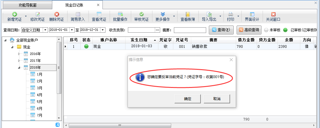在功能導(dǎo)航窗點(diǎn)擊“現(xiàn)金日記賬”打開(kāi)現(xiàn)金日記賬界面,選擇一個(gè)“已審核”的日記賬憑證,然后點(diǎn)擊“更多操作”—》“反審憑證”(如下圖二所示),系統(tǒng)會(huì)彈出提示信息“您確定要反審當(dāng)前憑證?”(如下圖三所示),點(diǎn)擊“確定”按鈕即可對(duì)“已審核”憑證進(jìn)行反審操作,反審后,憑證狀態(tài)變?yōu)椤拔磳徍恕保藭r(shí)可以對(duì)這個(gè)未審核的憑證進(jìn)行修改操作(如下圖四所示)。
