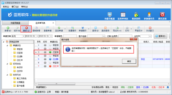 紅管家送貨單中內(nèi)置了一個簡單的流程:待簽回(新開單)-》已簽回(業(yè)務(wù)員送貨回來或者客戶已簽收快遞)-》已過賬(財務(wù)確認已收到貨款),用戶可以單據(jù)變化選擇標記單據(jù)狀態(tài),有時候會遇到需要刪除已簽回單據(jù)的情況。