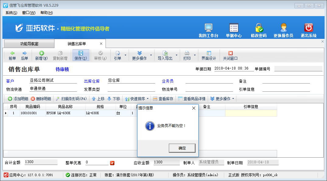 以信管飛倉(cāng)庫(kù)管理軟件為例,示范下如果設(shè)置開(kāi)銷售單時(shí)業(yè)務(wù)員允許為空。軟件安裝完成,系統(tǒng)參數(shù)設(shè)置默認(rèn)業(yè)務(wù)員不允許為空,正常開(kāi)銷售單,未在單據(jù)主體中輸入“業(yè)務(wù)員”,商品輸入完成后點(diǎn)擊“保存”按鈕,會(huì)提示“業(yè)務(wù)員不能為空”,如下圖1所示: