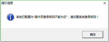 設置完成后,我們使用操作員賬號登陸軟件時,系統(tǒng)會提示“系統(tǒng)已配置為‘操作員登陸密碼不能為空’,請設置系統(tǒng)登陸密碼!”,如下圖二所示。