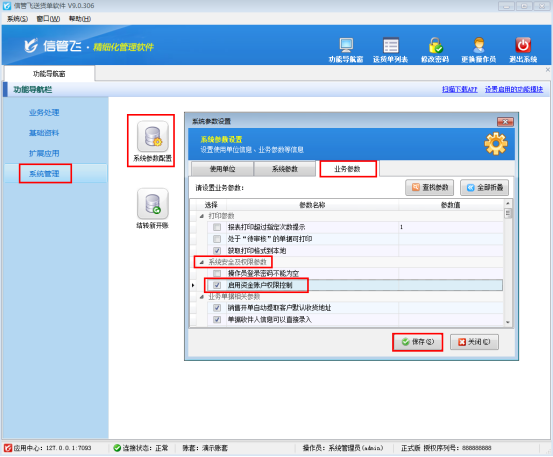 在功能導(dǎo)航窗選擇“系統(tǒng)管理”—》“系統(tǒng)參數(shù)配置”—》“業(yè)務(wù)參數(shù)”,進入業(yè)務(wù)參數(shù)設(shè)置界面,在“系統(tǒng)安全及權(quán)限參數(shù)”中勾選“啟用資金賬戶權(quán)限”參數(shù),然后保存,如圖1所示。