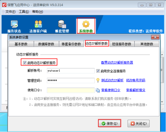動態(tài)IP解析服務屬于增值服務,使用需要另外進行購買,購買后會分配解析賬號、管理密碼和使用口令信息,首先需要配置主機電腦(插入加密鎖的電腦),在主機電腦上打開應用中心程序(紅色圖標),點擊“系統參數”,在系統參數設置界面,選擇“動態(tài)IP解析參數”,在此界面勾選啟用“動態(tài)IP解析服務”,把分配的解析賬號和管理密碼復制其中,點擊保存即可(可以點擊測試動態(tài)IP解析進行測試是否注冊),如下圖1所示: