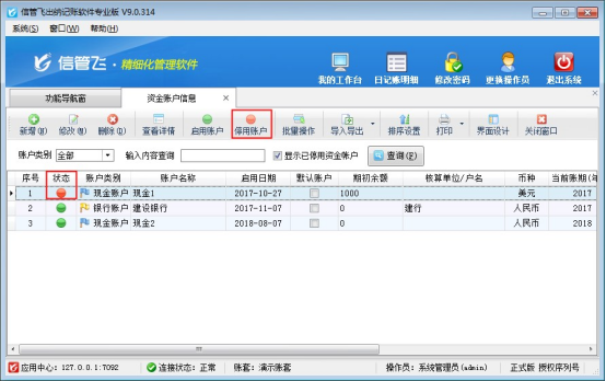 信管飛財務出納記賬軟件可以同時建立多個資金賬戶,進行管理多個資金賬戶賬目,在實際業務需求中可能會出現資金賬戶變動,需要停用之前賬戶及設置在出納日記賬中不顯示此賬戶,我們以“信管飛出納記賬軟件專業版”為例示范下如何停用資金賬戶及設置不顯示。