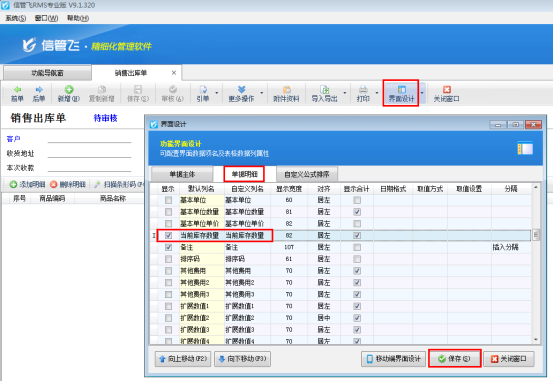 打開(kāi)軟件的“銷(xiāo)售管理”模塊,新開(kāi)一個(gè)銷(xiāo)售出庫(kù)單,點(diǎn)擊“界面設(shè)計(jì)”選擇“單據(jù)明細(xì)”數(shù)據(jù)項(xiàng),找到“當(dāng)前庫(kù)存數(shù)量”數(shù)據(jù)項(xiàng)并勾選上,保存界面設(shè)計(jì)。如圖1所示: