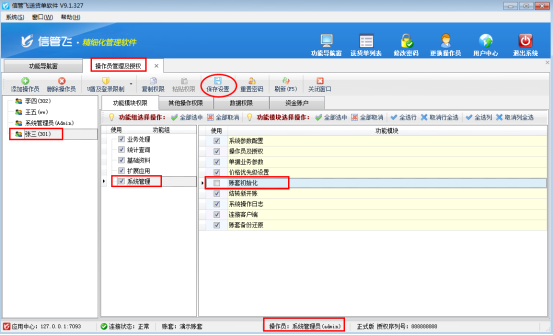 信管飛送貨單軟件、信管飛RMS、信管飛倉庫管理軟件、信管飛出納記賬軟件中都可以進(jìn)行賬套初始化,在正式使用軟件過程中,為了防止操作員不小心初始化賬套,可以對操作員設(shè)置操作權(quán)限。下面我們以信管飛送貨單軟件為例來演示一下如何設(shè)置操作員不可賬套初始化。