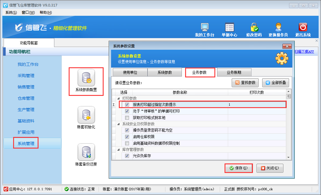 在業(yè)務(wù)參數(shù)界面將打印參數(shù)內(nèi)“報(bào)表打印超過指定次數(shù)提示”勾選上,并將打印次數(shù)設(shè)置一下,軟件中默認(rèn)的打印次數(shù)是1,可以根據(jù)自己的實(shí)際需求進(jìn)行設(shè)置,最后進(jìn)行保存。