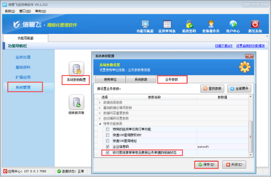 首先需要啟用參數(shù)“收付款結(jié)算單審核后更新業(yè)務(wù)單據(jù)的結(jié)銷狀態(tài)”,如下圖所示,在功能導(dǎo)航窗選擇“系統(tǒng)管理”—》“系統(tǒng)參數(shù)配置”—》“業(yè)務(wù)參數(shù)”中的特殊功能參數(shù)中,勾選啟用此參數(shù),然后保存配置。