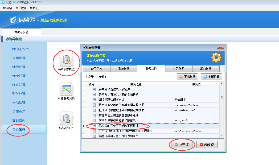 在功能導航窗點擊“系統管理”→“系統參數設置”→“業務參數”可以打開“業務參數”配置界面,在業務單據相關參數內打鉤啟用“已發貨的訂單不可修改不可紅沖”參數,然后點擊“保存”按鈕保存設置,如下圖1所示。
