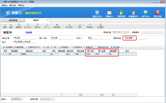 ②選擇調撥類型后,下面的單據明細會自動切換需要輸入的數據項(調入單價、調入金額、調撥差額)。