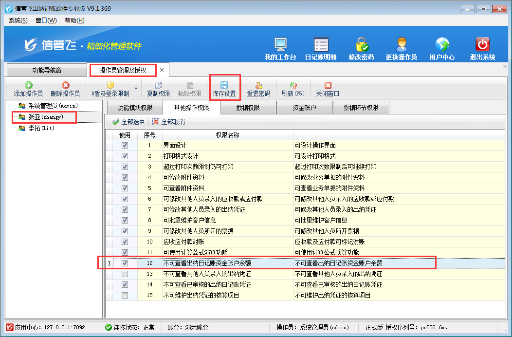 注意:設置操作員不可查看出納日記賬資金賬戶余額權限為V9.1.369版本增加的功能,如需要使用此功能,需升級到最新版。