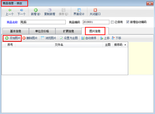在功能導(dǎo)航窗點“基礎(chǔ)資料”—》“商品信息”即可進入“商品信息”界面,對商品進行新增或修改時可以編輯商品信息、上傳商品圖片信息。以商品“電腦”為例,對商品進行修改,系統(tǒng)彈出“商品信息修改”窗口,點擊“圖片信息”頁面,如圖1所示。